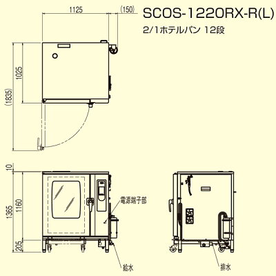 仕 様 【メーカー】ニチワ 【型 番】SCOS-1220RX-R(L) 【電 源】三相200V 【外形寸法】幅1125×奥行1025×高さ1365(mm) 【内形寸法】幅620×奥行825×高さ955(mm) 【消費電力】37.4kW 【製品質量】400kg 【棚ピッチ×棚数】65P×12段 【スチーマーモード】30〜160℃ 【自動加湿オーブンモード】30〜300℃ 加湿量10段階 【オーブンモード】30〜300℃ 【設定時間範囲】1〜999分・連続運転 【芯温調理】各モード可能・30〜99℃ 【庫内ファン】オートリバース式 【風量調整】4段階切替 【プログラム調理】10ステップ100メニュー(ひらがな・カタカナ・漢字登録可能) 【操作パネル】液晶フルフラットタッチパネル 【ハンドシャワー】標準装備 【付属品】耐熱オーブンミット(1対)、洗剤(946ml×1本)、スプレーガン(1個) ラックカート(1台)、軟水器(1台)、本体固定金具(2個) 【オプション(別売り)】 ホテルパン: 2/1サイズ 530×650×(深さ20/40)(mm) 1/1サイズ 530×325×(深さ25/65/100/150)(mm) 穴明ホテルパン: 2/1サイズ 530×650×(深さ20/40)(mm) 1/1サイズ 530×325×(深さ25/65/100/150)(mm) 焼網(グリッド):1/1サイズ 530×325(mm) 焼皿(エナメルコーティング):1/1サイズ 530×325×20(mm) オーブン用洗剤(4L×2本)、庫内専用スケール除去剤(4L×2本)、スプレイヤー 全自動軟水器、シリコンオーブンミット 【備 考】 ※設置の際は上方にファン付排気フード(ダクト)を設置してください。
