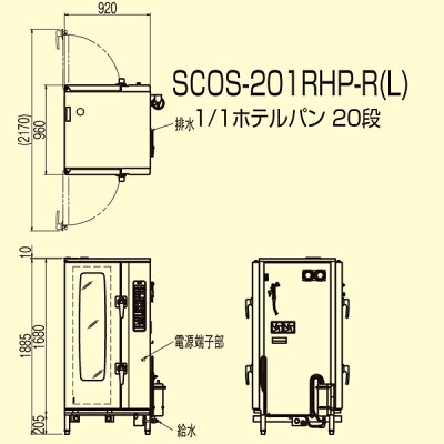 仕 様 【メーカー】ニチワ 【型 番】SCOS-201RHP-R(L) 【電 源】三相200V 【外形寸法】幅920×奥行960×高さ1885(mm) 【内形寸法】幅415×奥行750×高さ1475(mm) 【消費電力】38.7kW 【製品質量】465kg 【棚ピッチ×棚数】65P×20段 【付属品】耐熱オーブンミット(1対)、洗剤(946ml×1本)、スプレーガン(1個) 軟水器(1台)、モービルラック(1台)、本体固定金具(2個) 【オプション(別売り)】 ホテルパン: 1/1サイズ 325×530×(深さ25/65/100/150)(mm) 1/2サイズ 325×265×(深さ65/100/150)(mm) 1/3サイズ 325×176×(深さ65/100/150)(mm) 穴明ホテルパン: 1/1サイズ 325×530×(深さ25/65/100/150)(mm) 1/2サイズ 325×265×(深さ65/100/150)(mm) 1/2サイズ・ホテルパン用ホルダー、1/3サイズ・ホテルパン用ホルダー 焼網(グリッド):1/1サイズ 530×325(mm) 焼皿(エナメルコーティング):1/1サイズ 530×325×20(mm) オーブン用洗剤(4L×2本)、庫内専用スケール除去剤(4L×2本)、スプレイヤー 全自動軟水器、シリコンオーブンミット、ラックトロリー 【備 考】 ※設置の際は上方にファン付排気フード(ダクト)を設置してください。